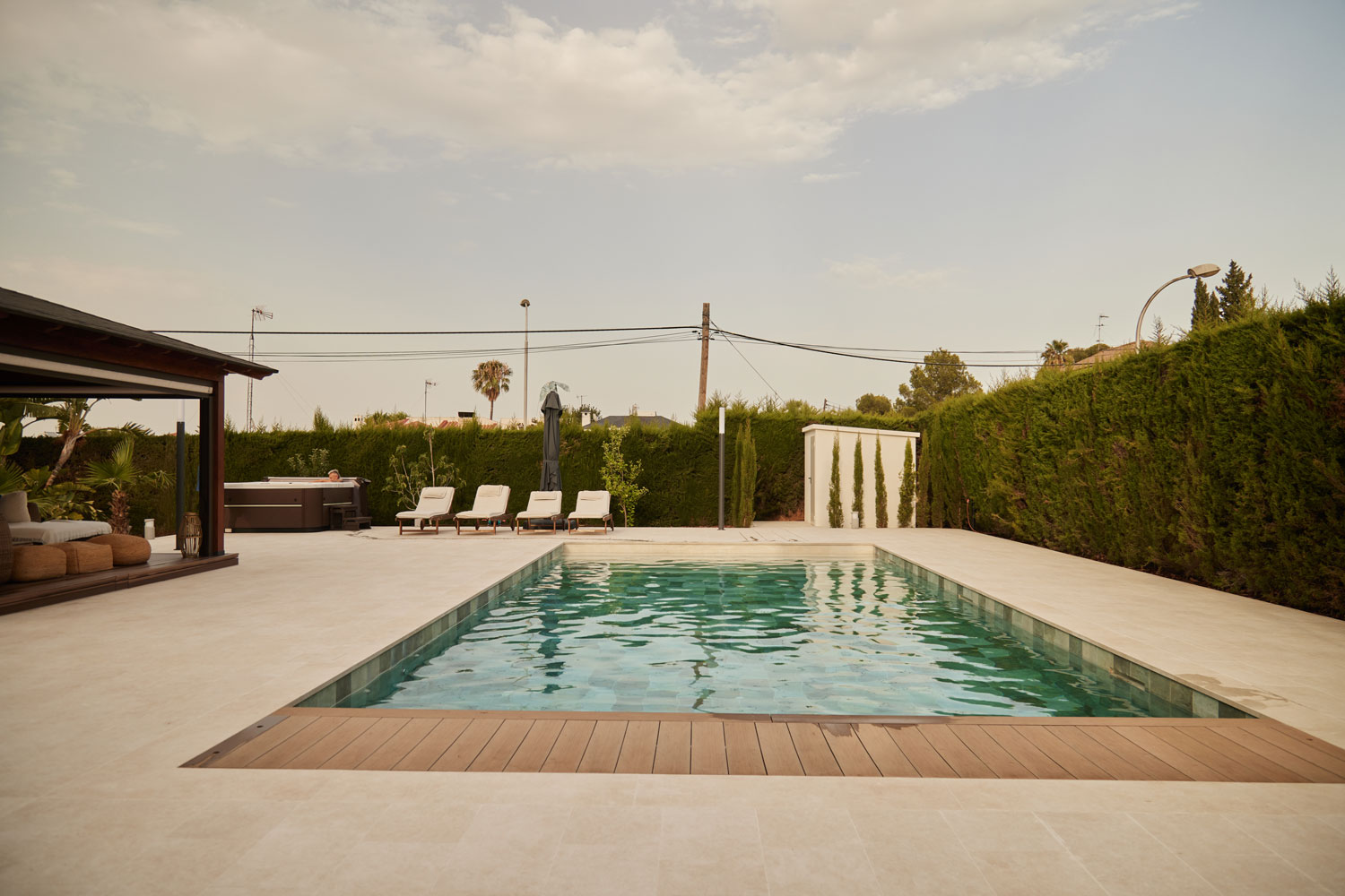 En la urbanización Olimar, en Chiva (Valencia), esta reforma de piscina apuesta por una estética minimalista y serena, perfectamente integrada en su entorno ajardinado.